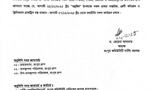 Notice of class postponed on 25th December, It is hereby notified to all teachers & students of all years that the regular classes of Rangpur Community Nursing College (RCNC) will remain closed on 25th December 2025, in observance of Christmas Day 2025. FROM 27th DECEMBER......