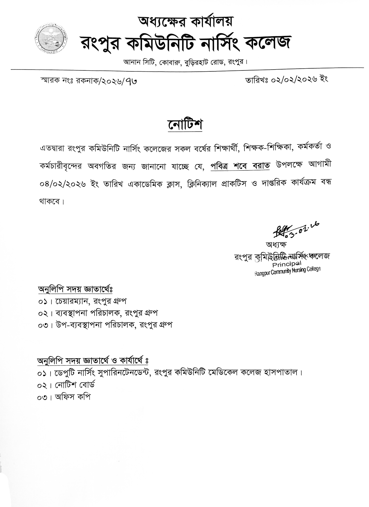 All classes of RCNC will remain closed on Wednesday, 4th February 2026 on account of ‘Shab-E-Barat’. All scheduled classes of RCNC will be held on Thursday, 5th March 2026 as usual as per Class Routines as Scheduled.
