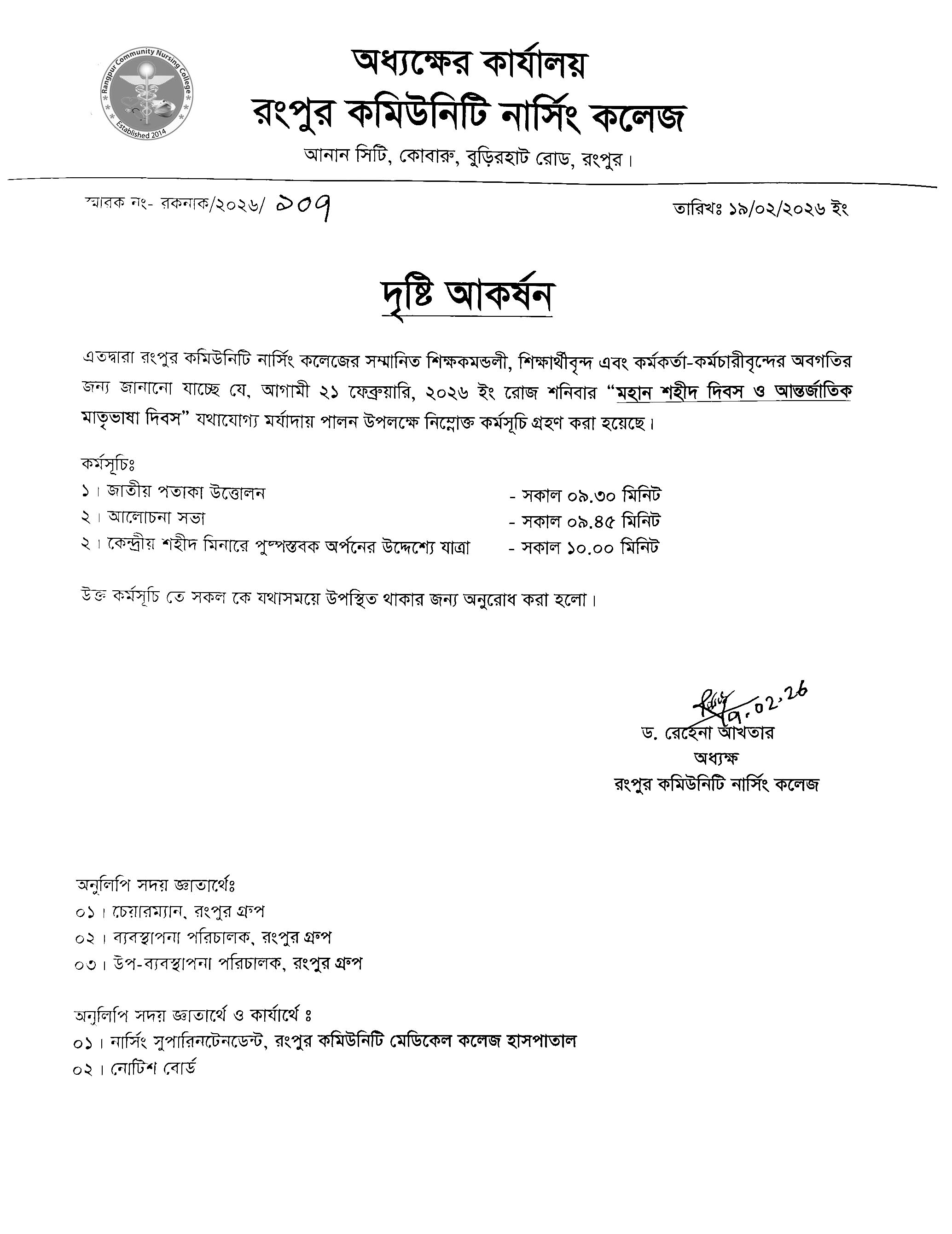On 21st February, Rangpur Community Nursing College will arrange an event to honour the sacrifices of our martyrs who fought to attain the recognition of our mother tongue.