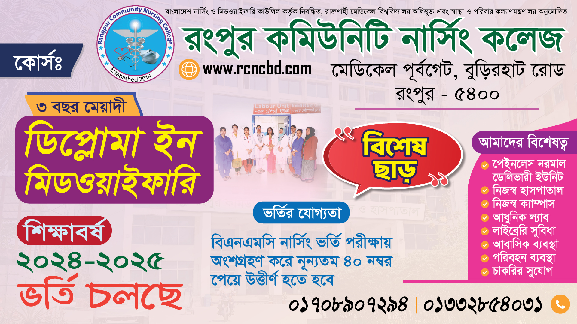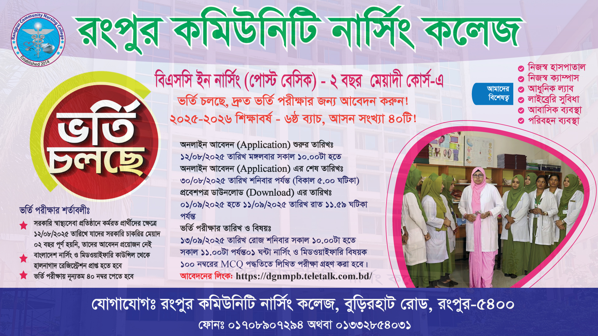Admission Circular Open for the Rangpur Community Nursing College Admission Going On: 2-Year B.Sc. in Nursing (Post Basic) Course Admission application for the 6th Batch (Session 2025–2026) has started. Our college is offering 40 seats in this program. 📌 Online Admission Application Link: 👉 https://dgnmpb.teletalk.com.bd Contact Address: Rangpur Community Nursing College Burirhat...